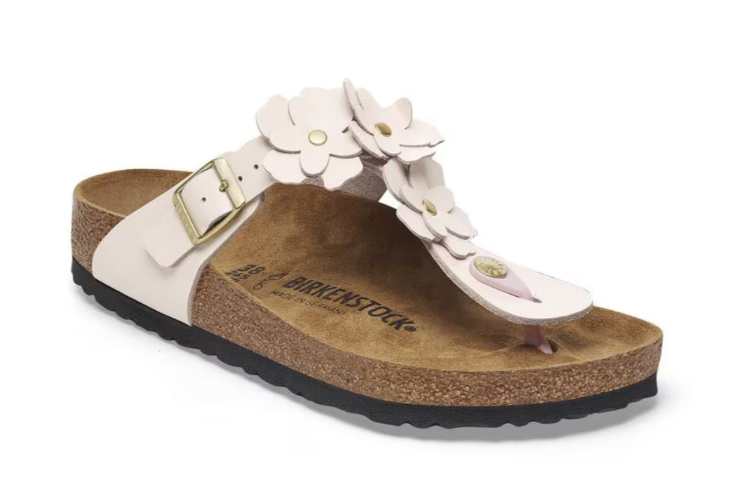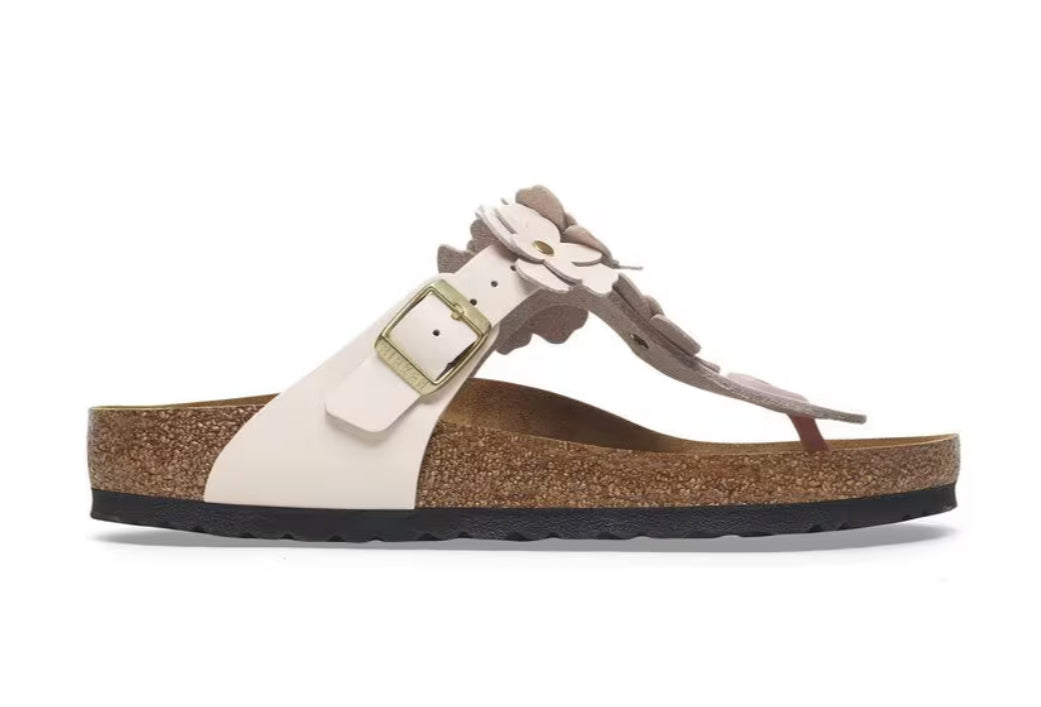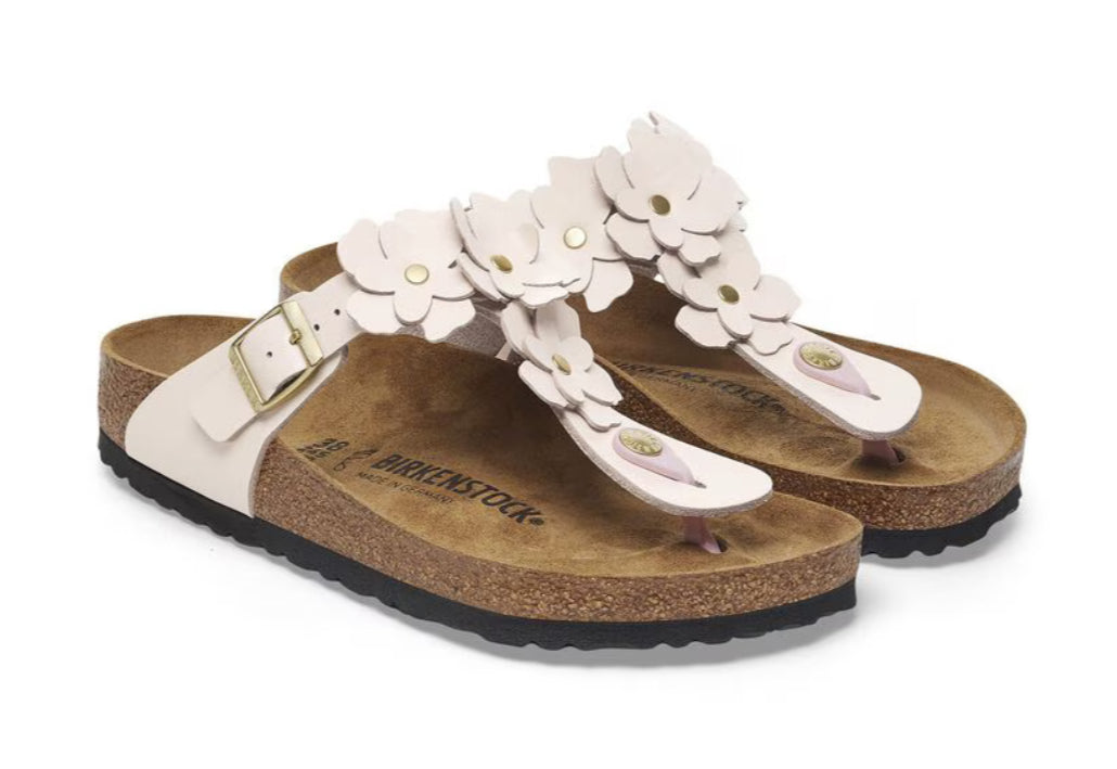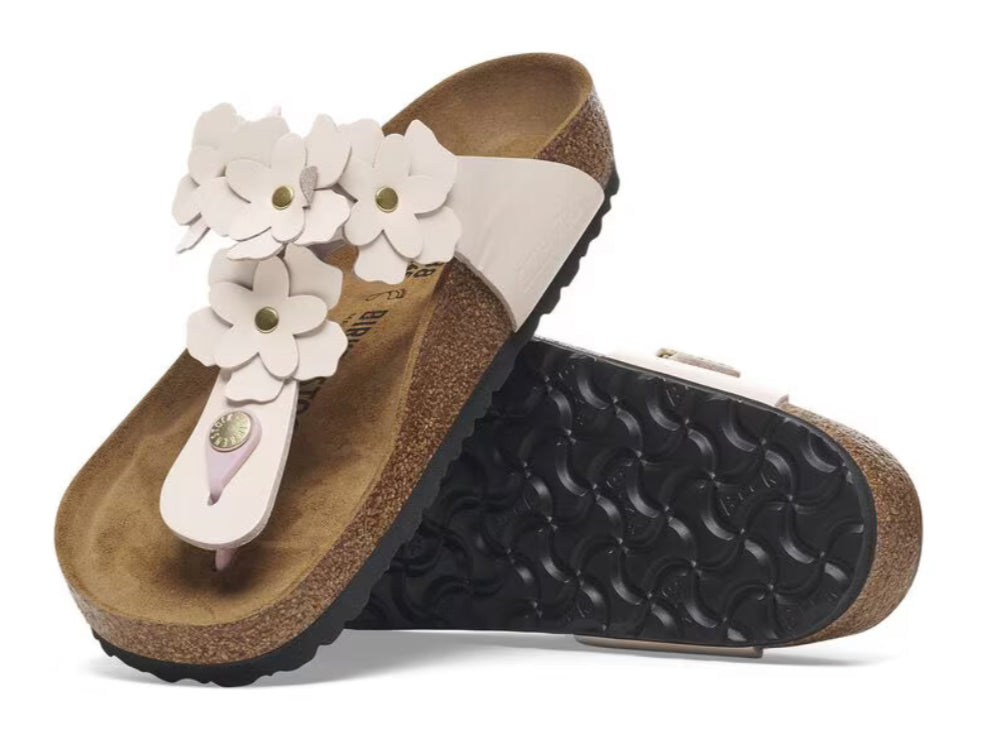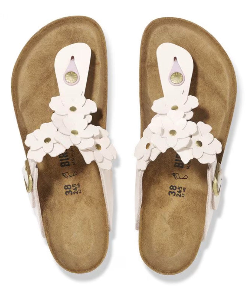 Der Gizeh ist der klassische Zehentrenner von BIRKENSTOCK. Diese Sandale ist aus Anilinleder in einer besonders femininen Variante mit Applikationsblumen. Das Fußbett ist ergonomisch geformt, aus Kork und mit Veloursleder bedeckter EVA-Sohle. Dieser Schuh ist ein Musthave in jedem Schuhschrank und bietet dir einen angenehmen Tragekomfort.