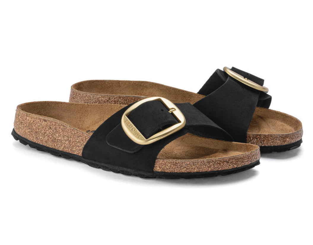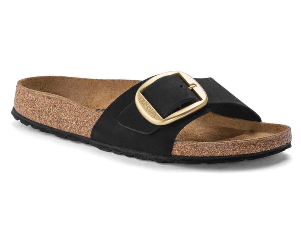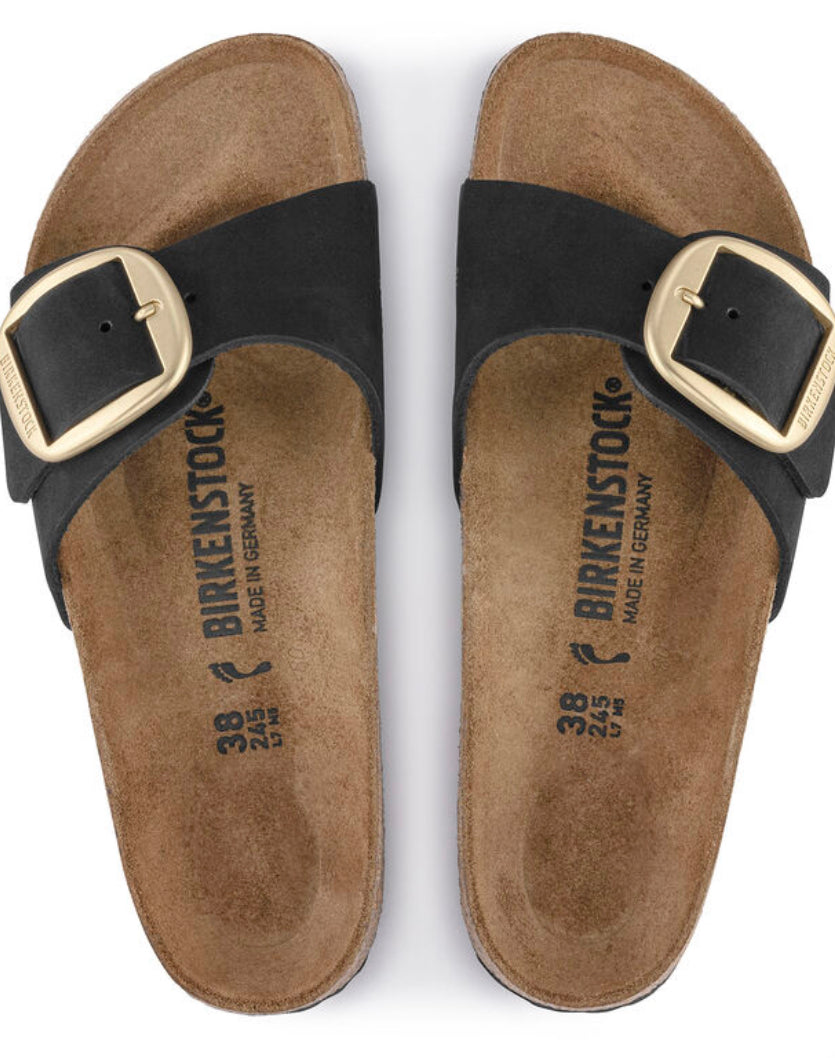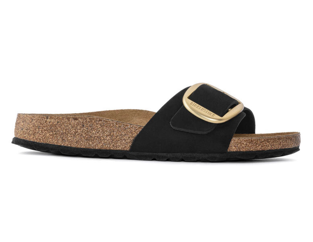 Madrid ist der klassische Einriemer von BIRKENSTOCK. Diese Sandale ist aus Nubukleder mit einer großen, eleganten Schnalle aus Metall. Das Fußbett ist ergonomisch geformt, aus Kork und mit Glattleder bedeckter EVA-Sohle.