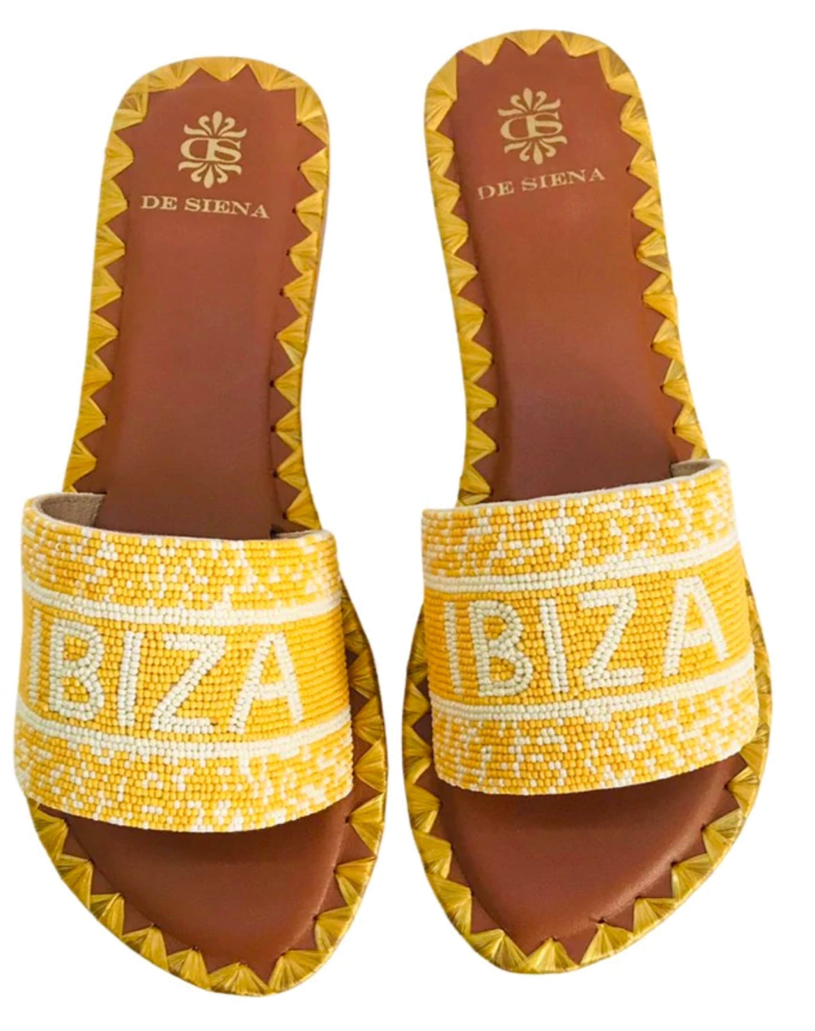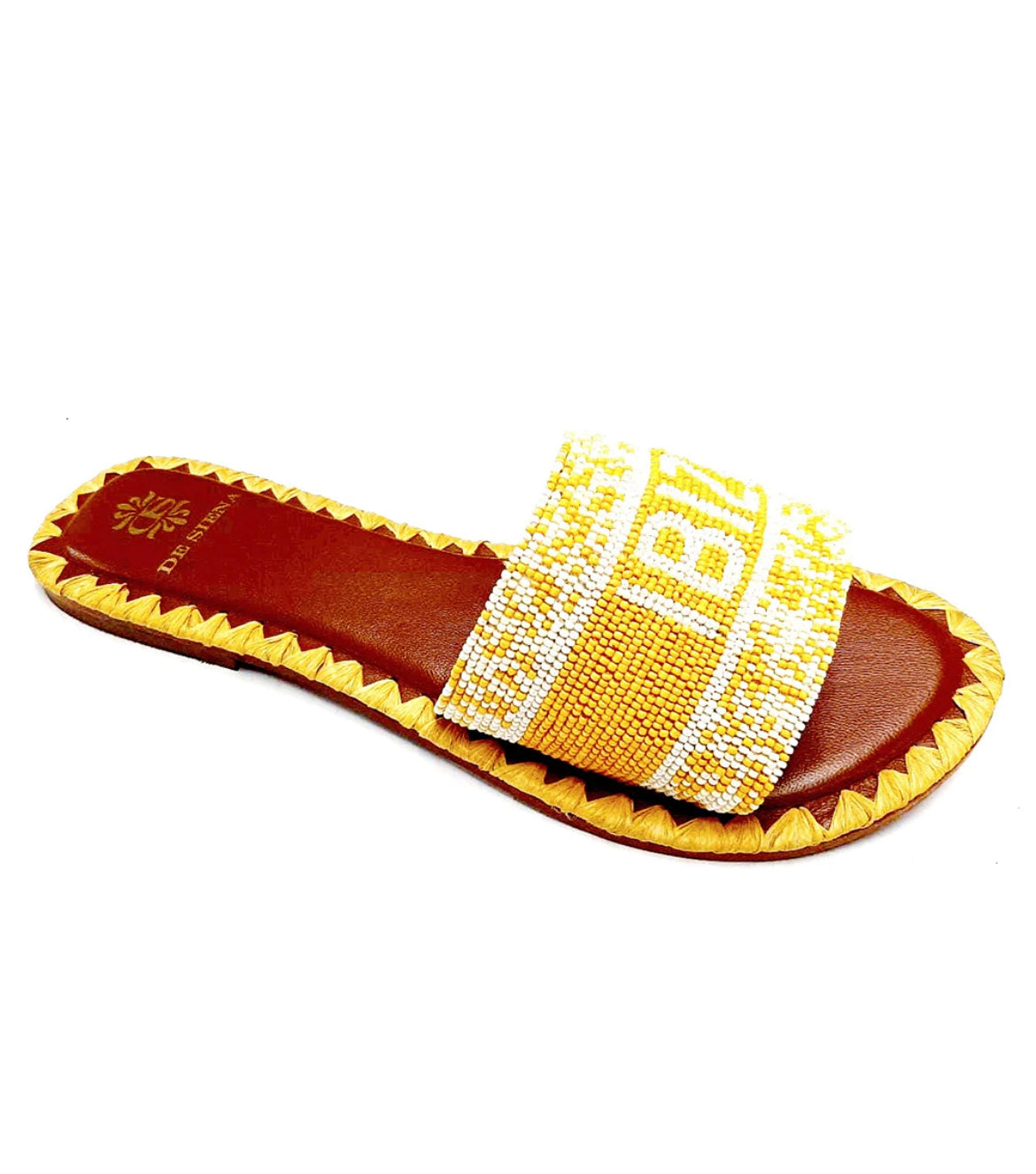 Handgefertigte Pantoletten von De Siena. Die Sohle aus Leder ist am Rand farblich abgestickt und der breite, mit Glasperlen besetzte Riemen zeigt uns deine Lieblingsstadt. Dein absolutes Must-Have für den Sommer.