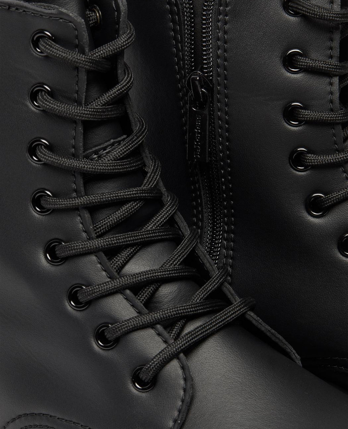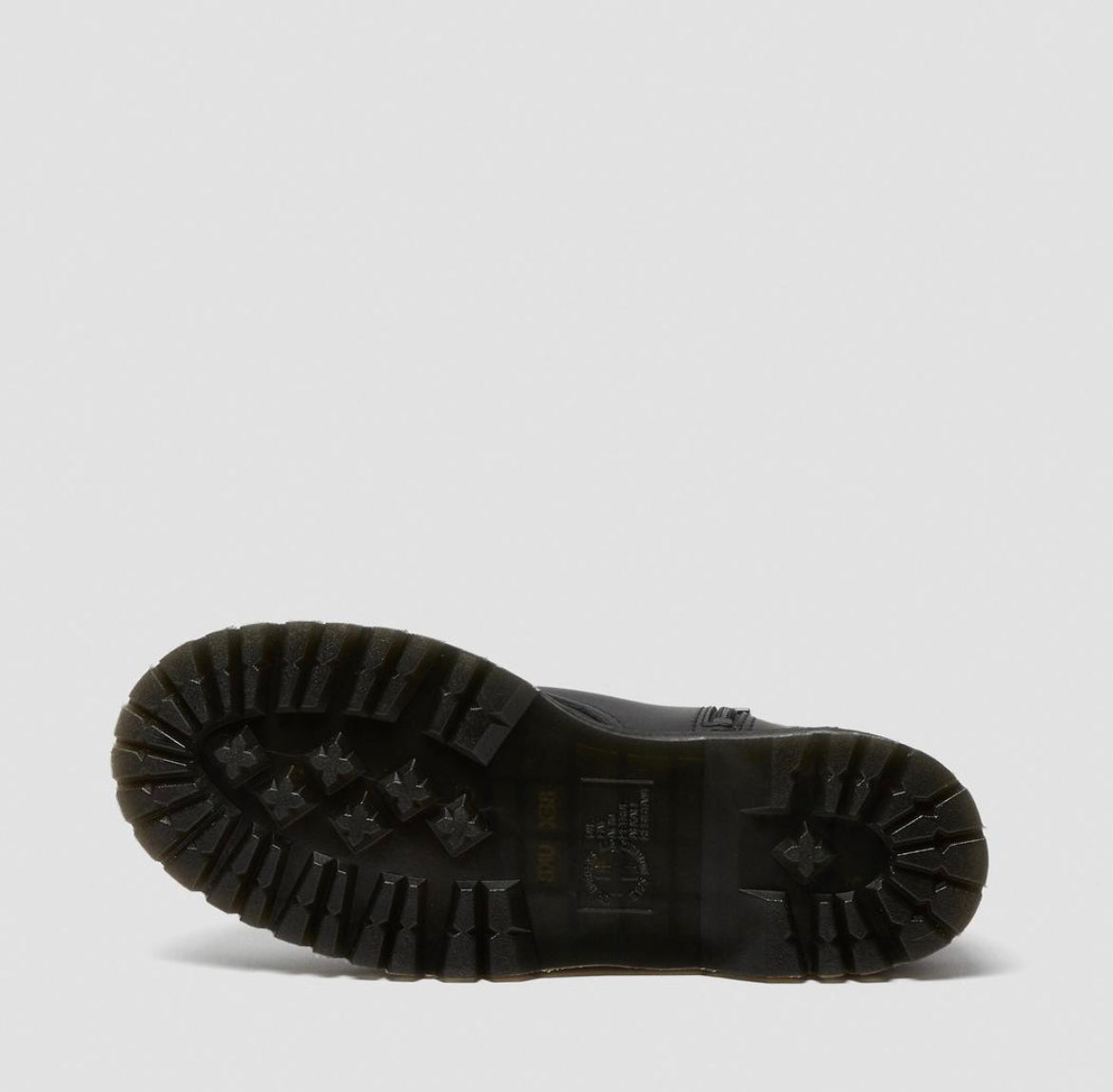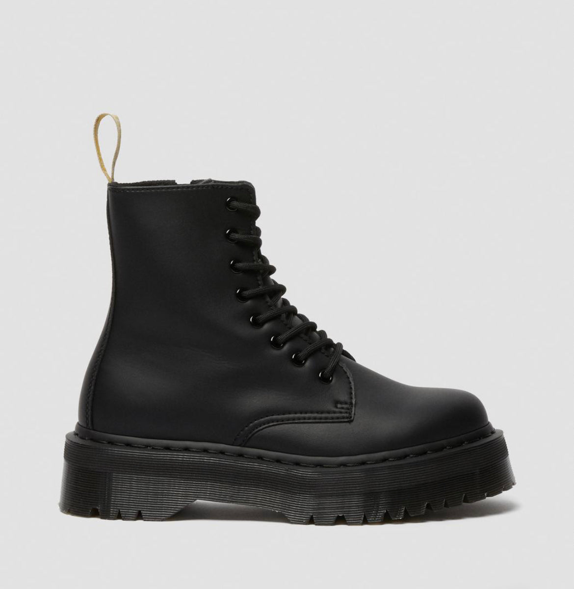 Der Dr.Martens Jadon fällt durch seine 1,5 Zoll hohe Plateausohle auf. Dieser Schuh ist aus einem veganen Leder in Mono Black, d.h. ohne gelbe Naht, in einer monochromen Farbvariante. Der seitliche Zipper erleichtert das An- und Ausziehen. Das Obermaterial ist vegan, aus 100% Synthetik und das Innenfutter 100% Textil.