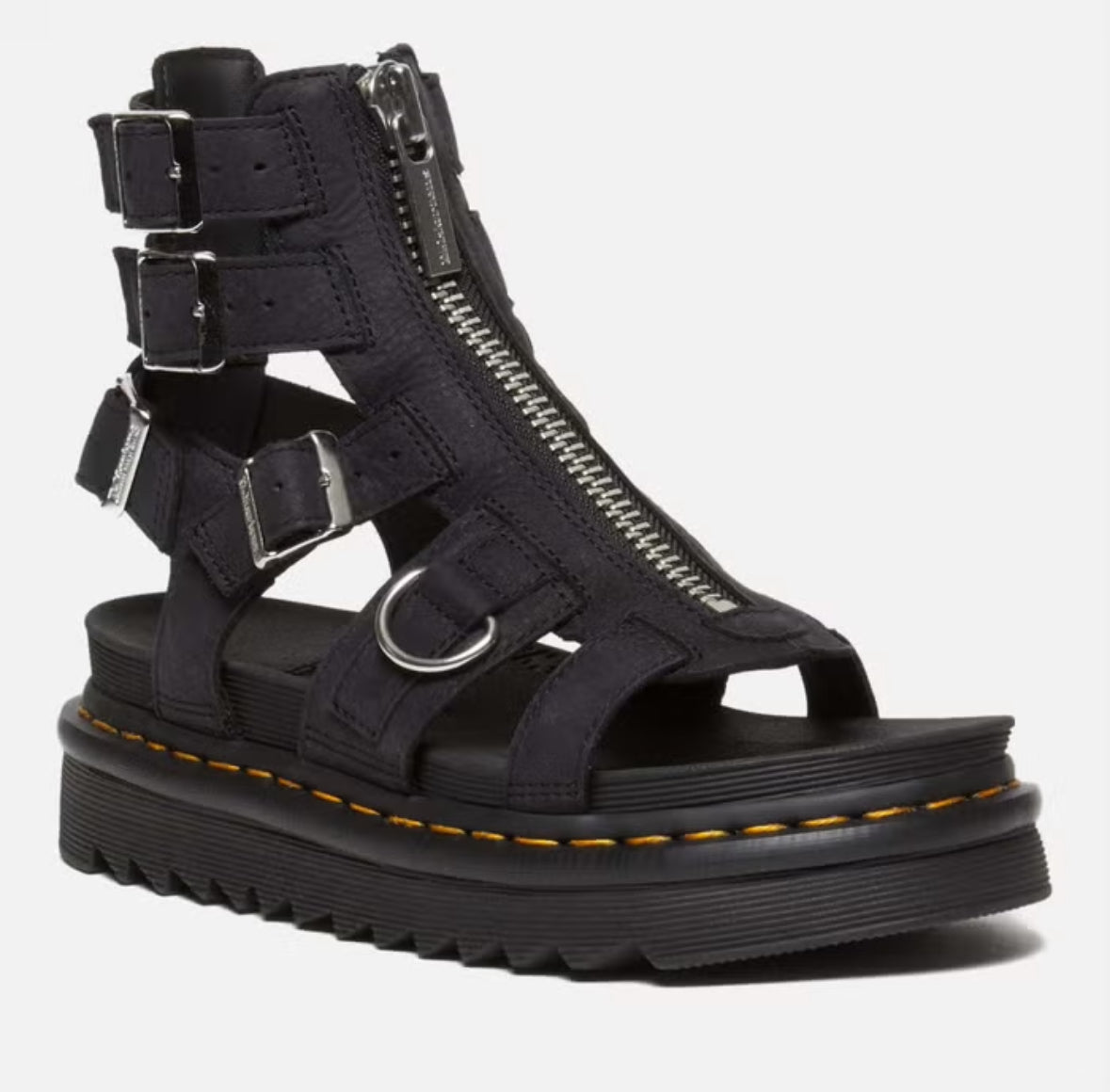 Diese Front-Zip-Gladiatoren-Sandale im unverwechselbaren Dr.Martens Stil ist superleicht und komfortabel. Die Sandale ist aus einem weichen Nubukleder und sitzt durch die verstellbaren Riemen perfekt am Fuß. Die Sohle ist extrem leicht aus EVA mit einem Rillenprofil.