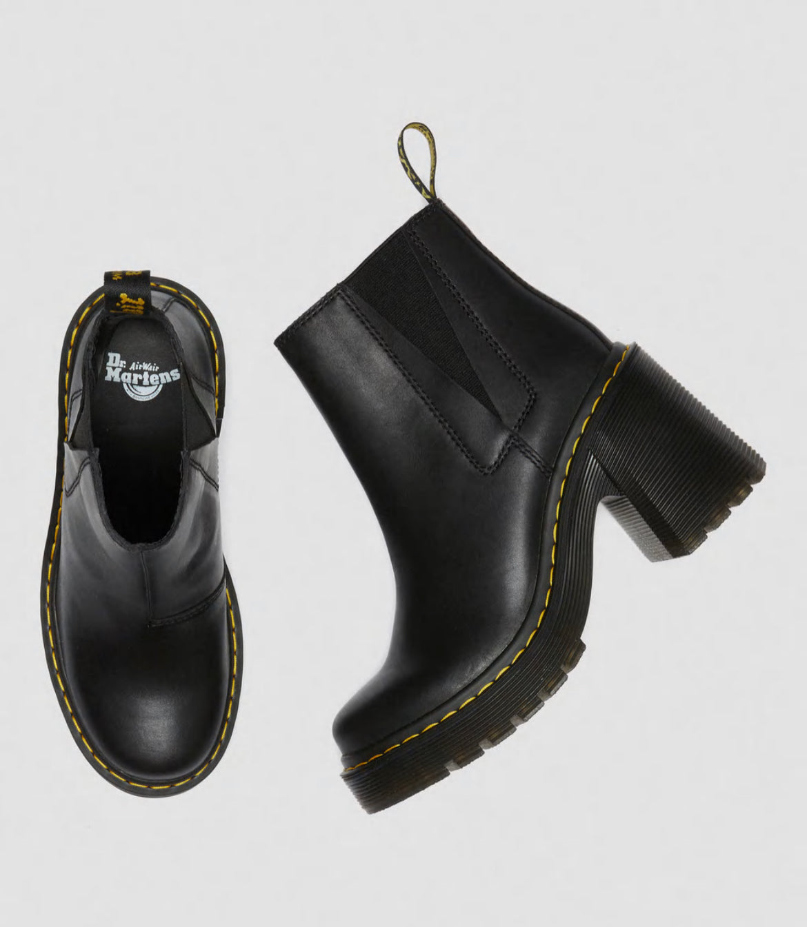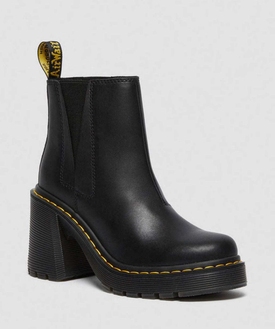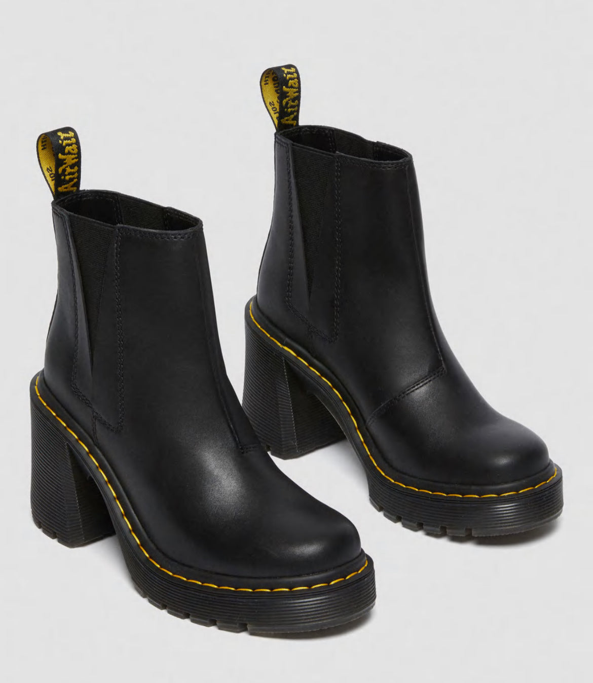 Der Dr.Martens Spence ist ein Chelseaboot mit ausgestelltem Absatz und klobigem Design. Dieser Schuh ist aus einem glatten, vollnarbigen Sendal-Leder. Im Gegensatz zu dem klassischen 1460 ist dieser Schuh von Beginn an weich und bequem. Die Absatzhöhe beträgt 8,6 cm.