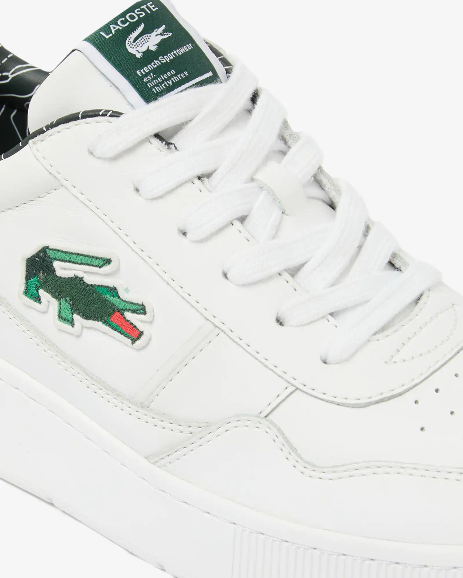Der Aceclip von Lacoste ist ein klassischer Tennisschuh aus hochwertigem Leder mit Blumenprint-Futter, Vintage-Schnürsenkeln und 3D-Krokodil-Grafik für das Holiday-Designpaket.